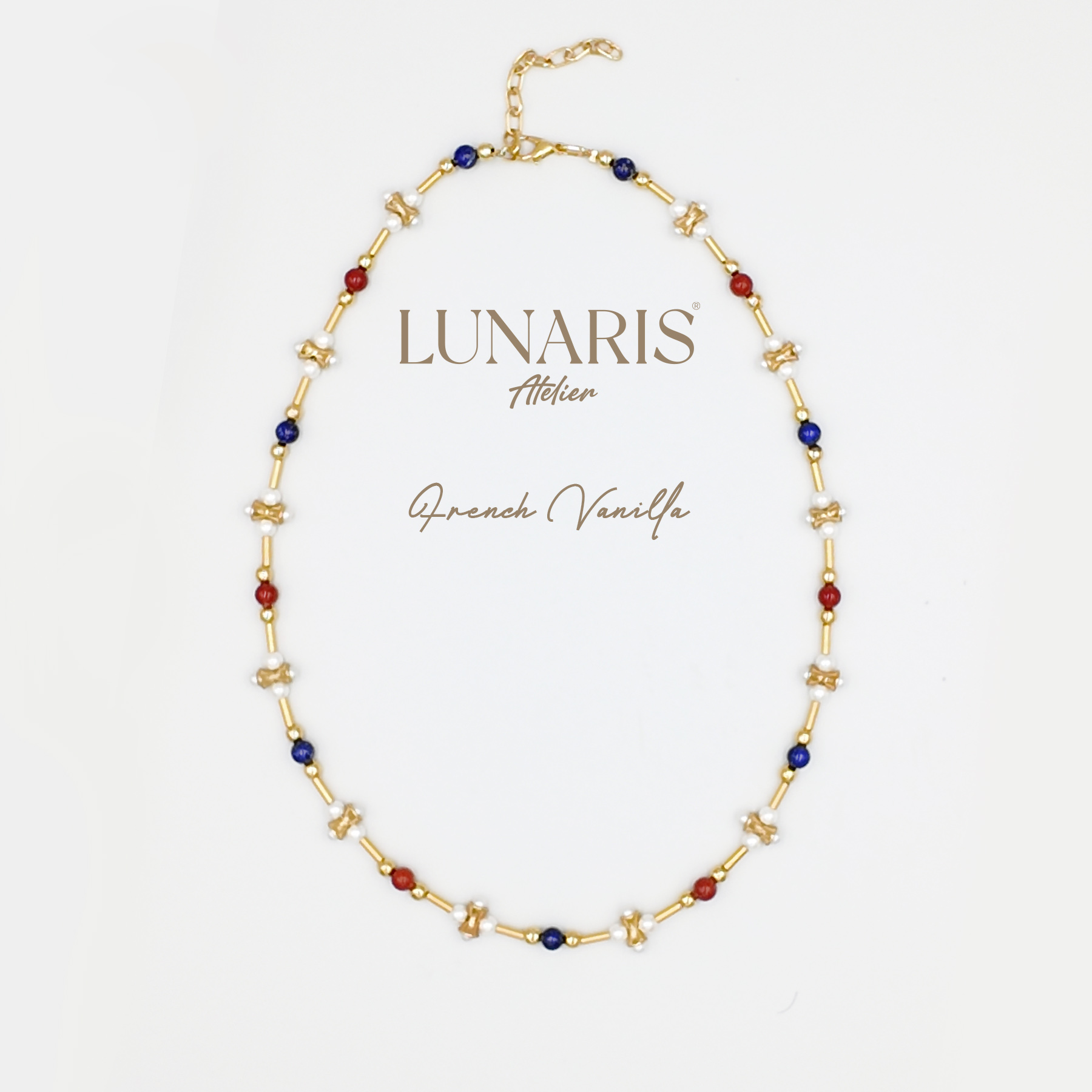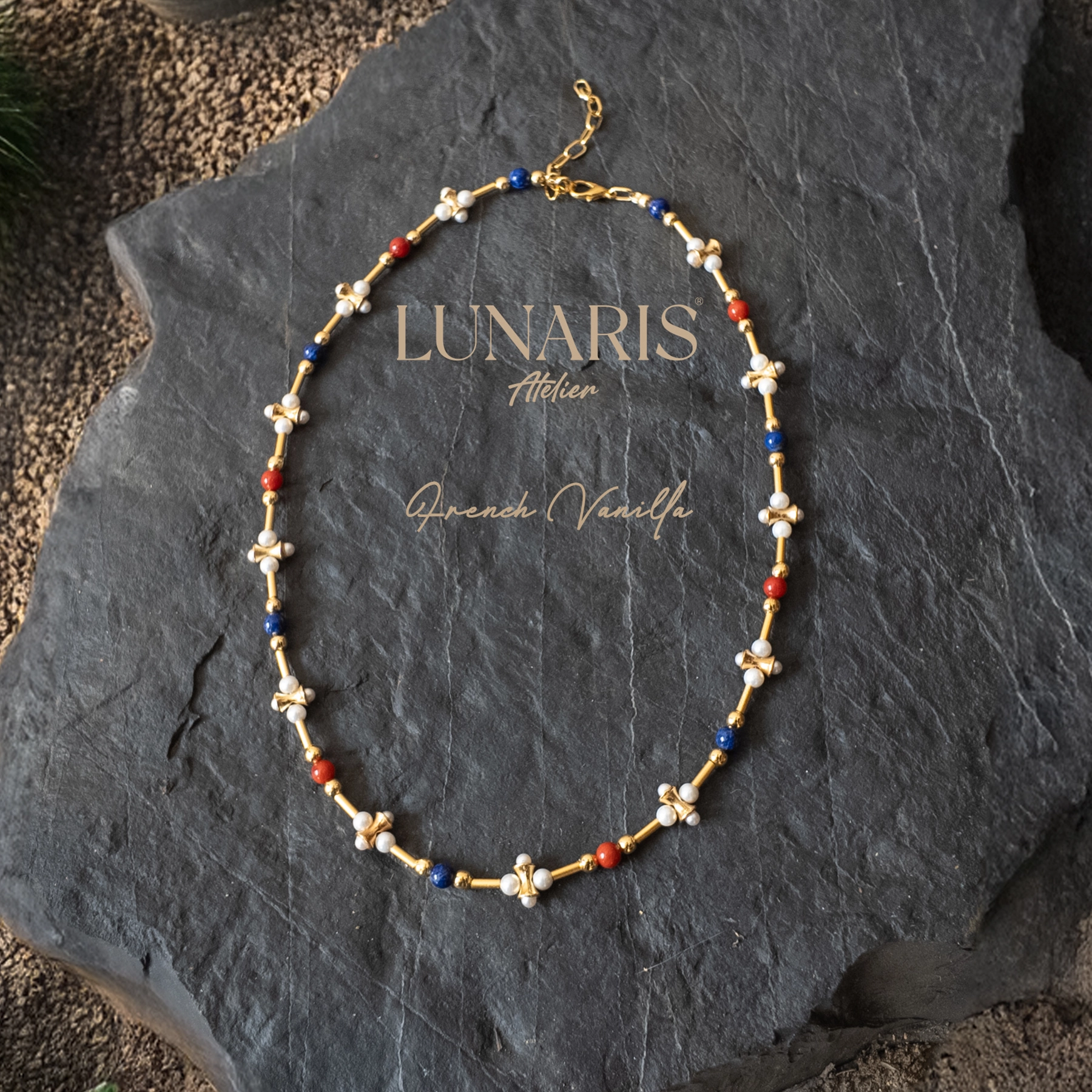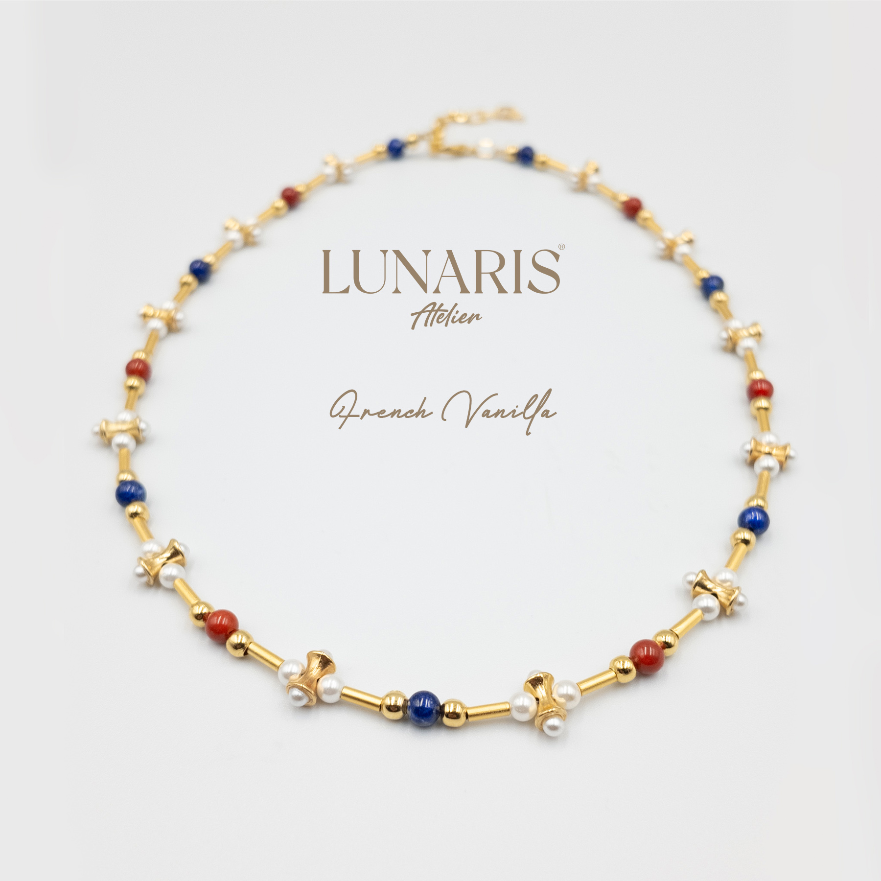 Lapis Lazuli’nin derin mavisi, tatlı su incilerinin saf beyazı ve mercan taşlarının tutkulu kırmızısı, “Fransız Vanilyası” kolyesinde eşsiz bir uyumla buluşuyor. Altın kaplama detaylarla zenginleştirilen bu özel tasarım, zarafet ve lüksü bir araya getiriyor.