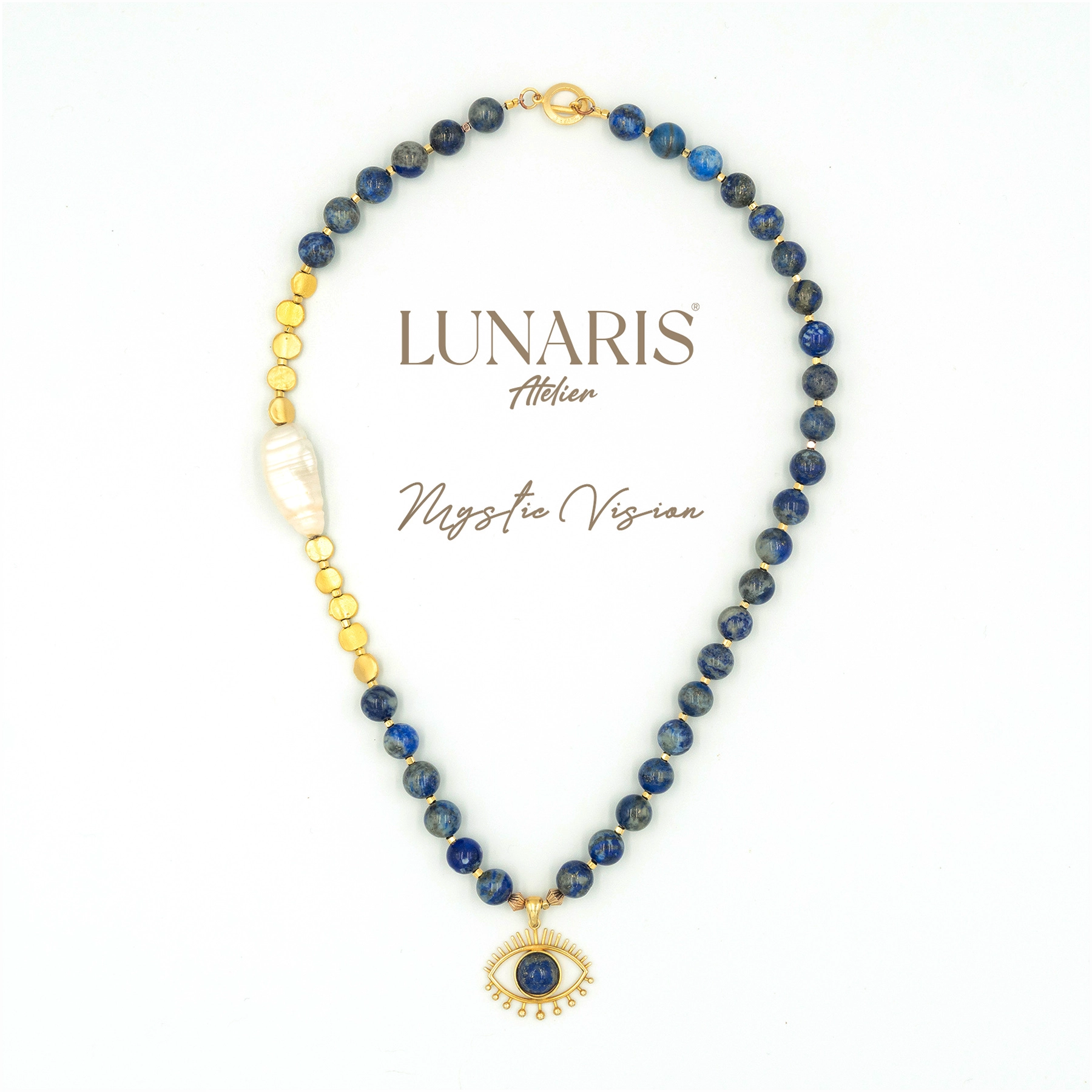 Zarif ve mistik bir tasarım olan bu el yapımı kolye, spiritüel gelişimi sağlayan göz alıcı Lapis Lazuli taşları, parıldayan bir inci detayı ve etkileyici altın göz figürü ile dikkat çekiyor. Göksel bir cazibeye ve zamansız bir zarafete sahip olan bu eşsiz parça, bilgeliğin ve güçlü sezgilerin bir simgesi olarak öne çıkıyor.