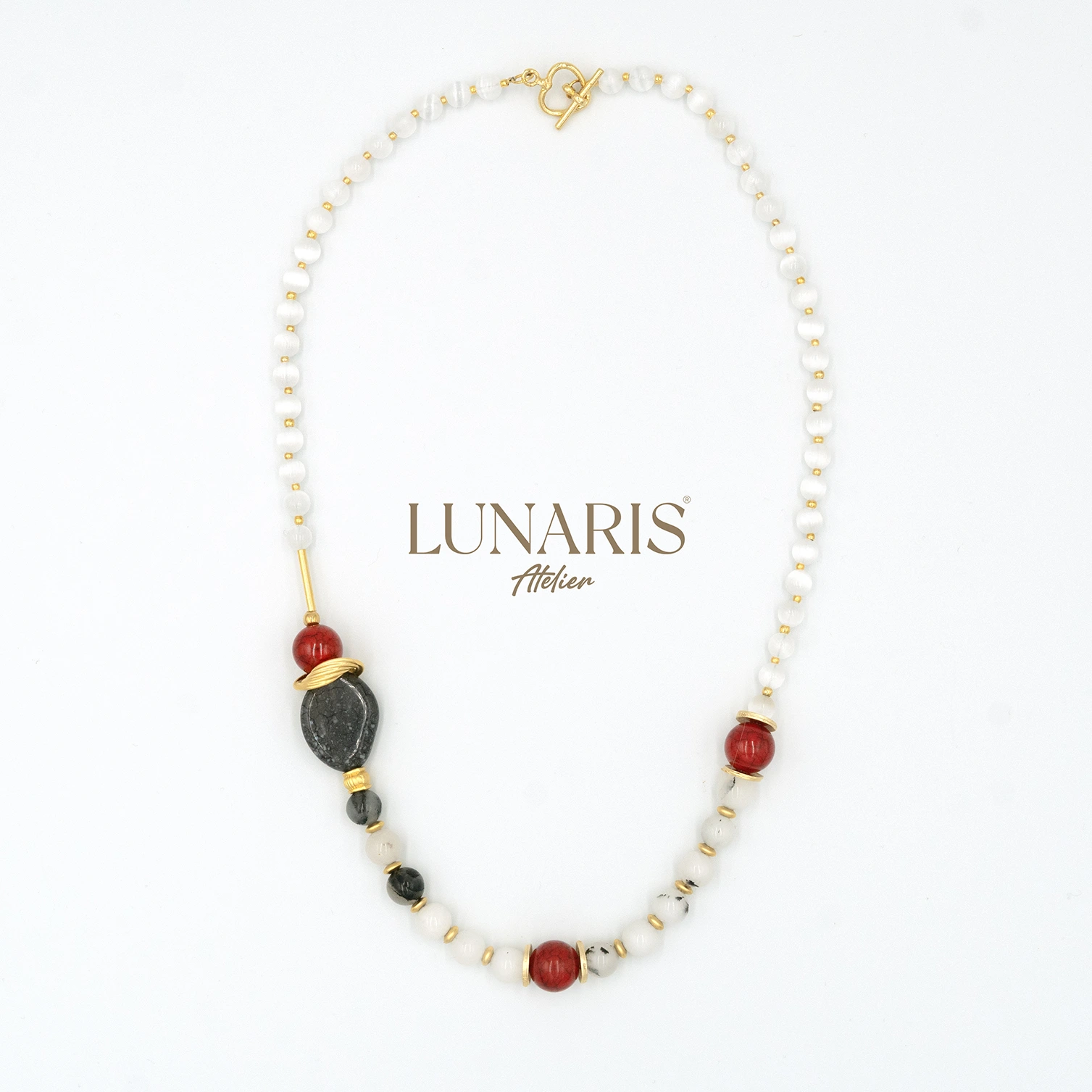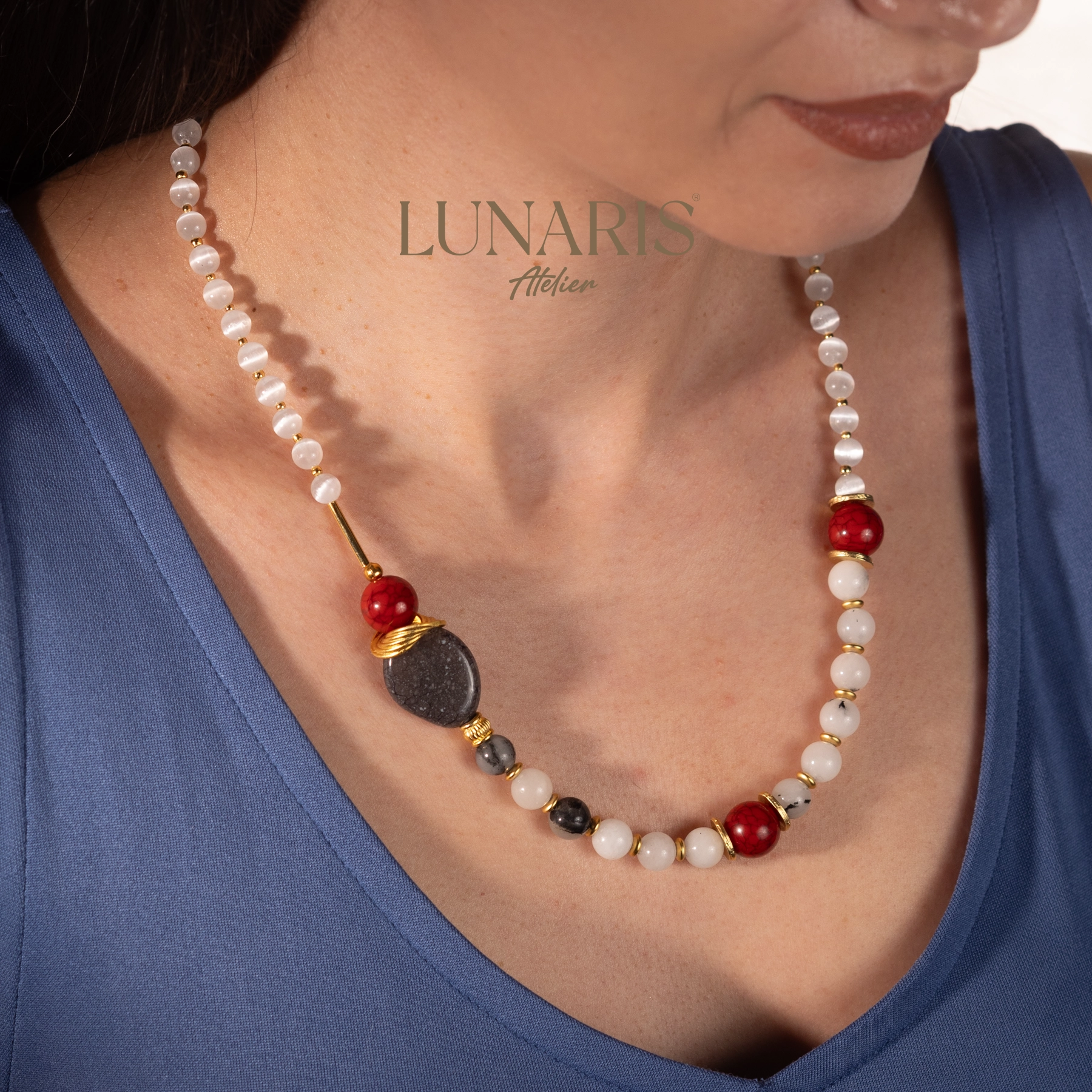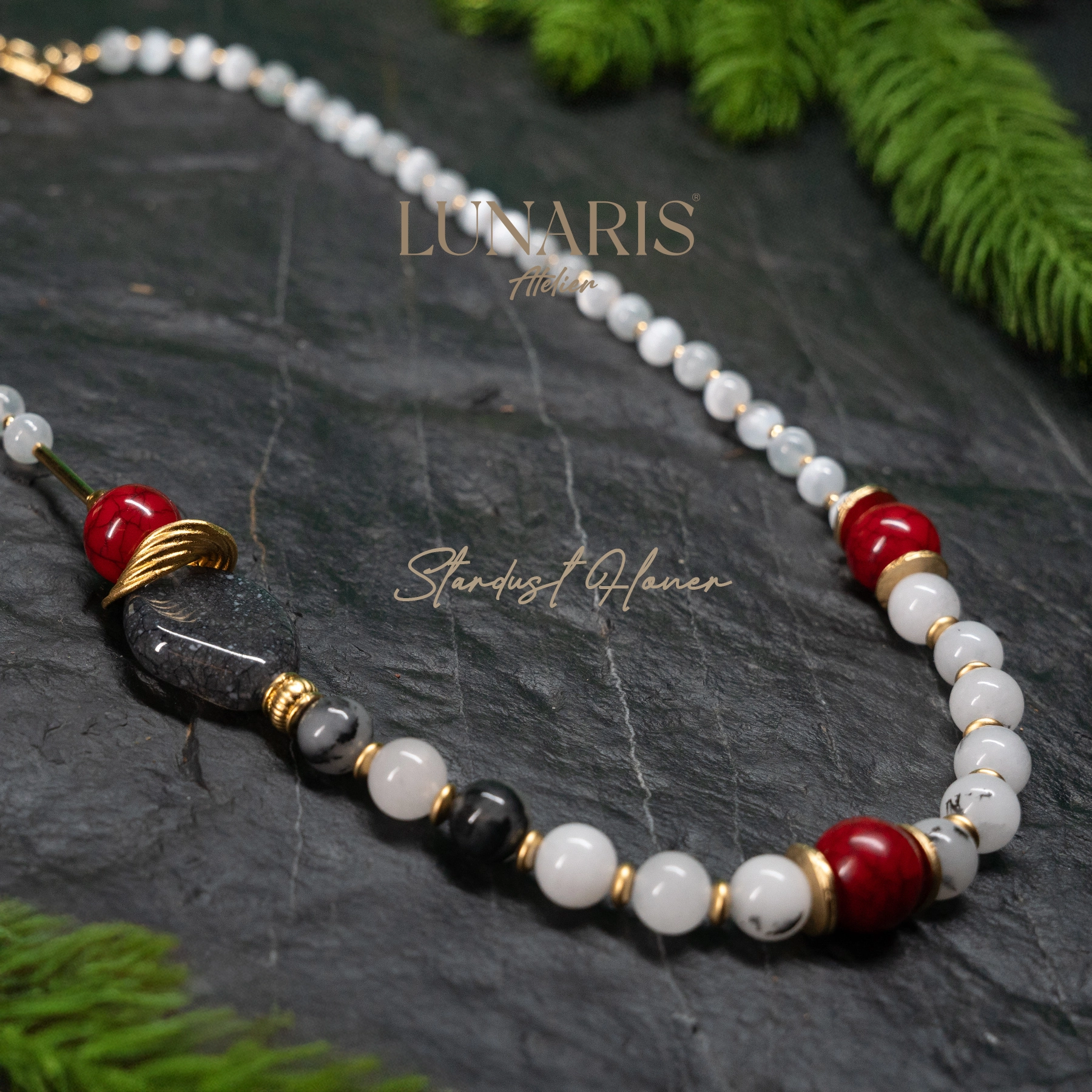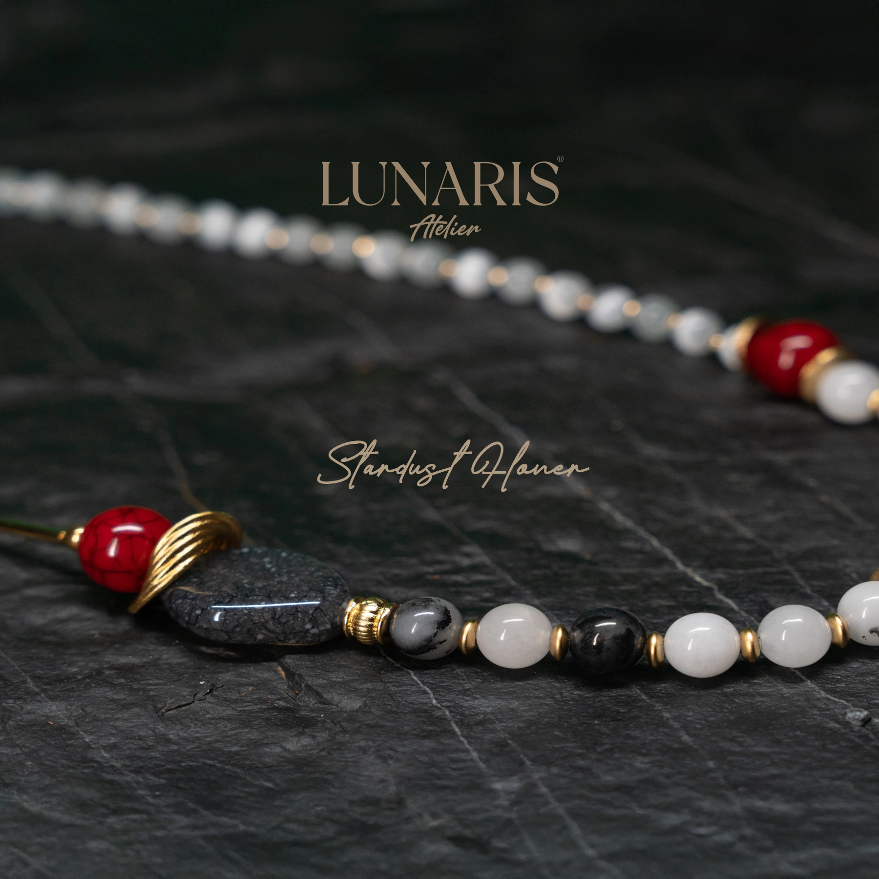 .Lunaris Atelier’in eşsiz tasarımı Stardust Flower, saf zarafetin ve doğal enerjinin birleşimini yansıtır. Selenit taşlarının sakinleştirici enerjisi, quartz taşlarının şifa gücüyle buluşarak hem ruhunuzu hem de stilinizi aydınlatır. Tasarımın merkezinde yer alan, altın detaylarla çevrelenmiş çiçek formundaki gri taş, gece gökyüzündeki yıldız tozunu anımsatan büyüleyici bir estetik sunar. Günlük kombinlerinize mistik bir dokunuş katmak veya özel anlarınızda zarafetinizi öne çıkarmak için mükemmel bir seçimdir.